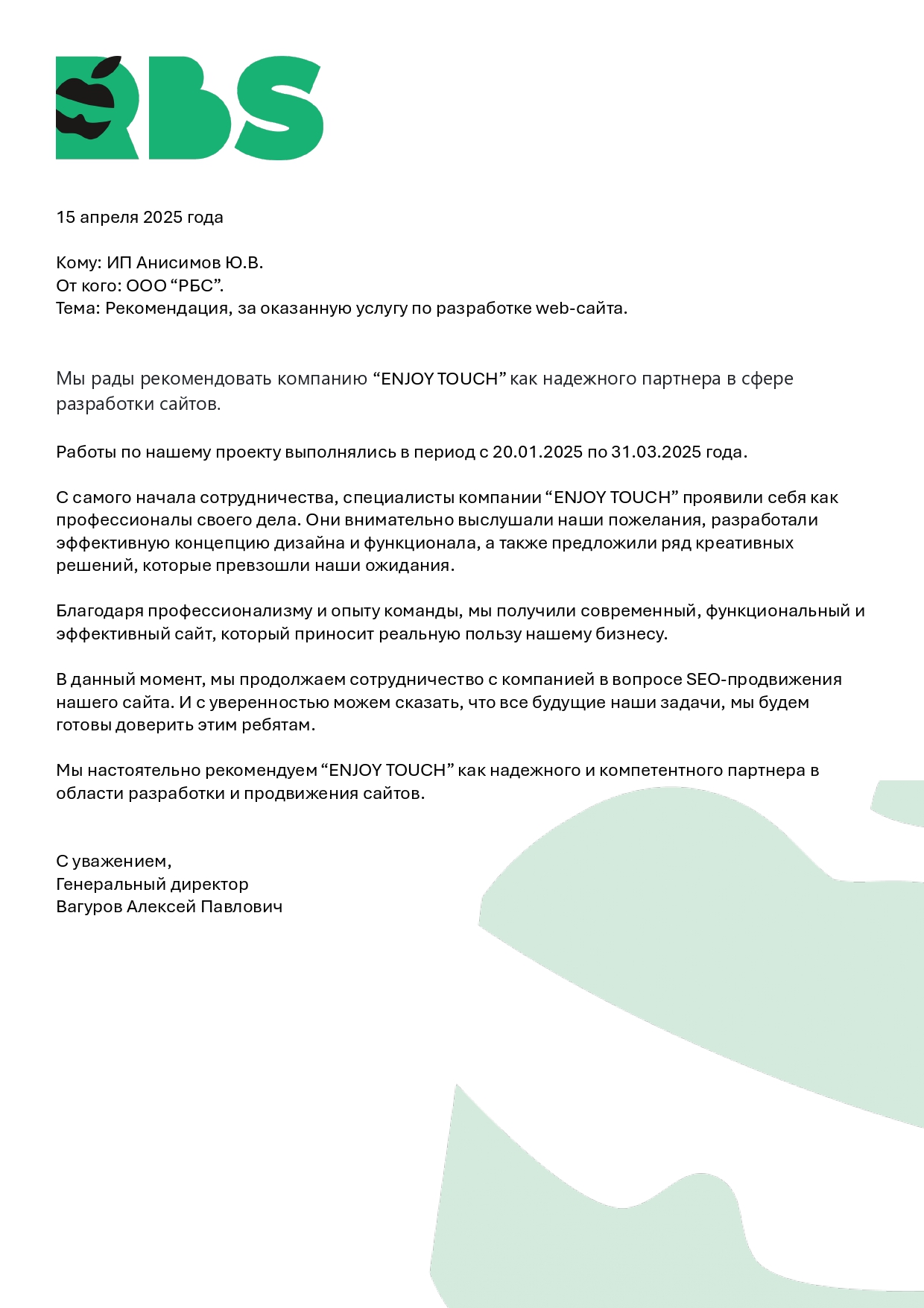 Сотрудничество с "ENJOY TOUCH" показало их высокий уровень компетенции, внимательное отношение к деталям и способность решать сложные технические задачи. Команда продемонстрировала глубокое понимание наших бизнес-потребностей и всегда стремилась к созданию решений, которые соответствуют или даже превосходят наши ожидания.